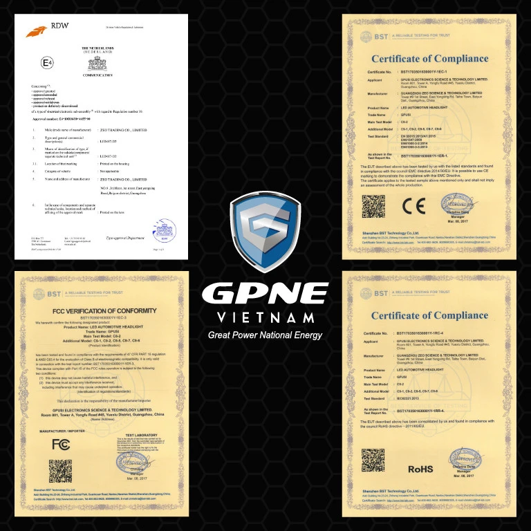 Với diện tích cơ sở sản xuất lên đến hơn 20.000m² cùng hệ thống quản lý chất lượng hoàn chỉnh và khoa học, các sản phẩm Đèn LED tăng sáng của GPNE đảm bảo chất lượng tuyệt đối do đều được sản xuất và tuân thủ nghiêm ngặt theo tiêu chuẩn quốc tế ISO 9001:2000, đạt chuẩn E-mark, CE, RoHS và các chứng nhận chất lượng khác. GPNE
